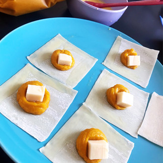 Once the squash is ready and warm, remove the garlic and thyme, then blend it with the maple syrup and the vinegar, adding the water gradually until a smooth and thick consistency, if necessary add more water but slowly to prevent a very liquid filling that will be hard to work with. Place the filling into a piping bag and fill a small portion in the middle of the wonton wrappers, then on top put a cheese cube, and with egg wash the corners to close the wonton. You will connect the corners to make a triangle shape, then connect the two ends of the tips to create the dumplings.